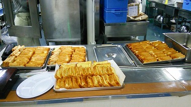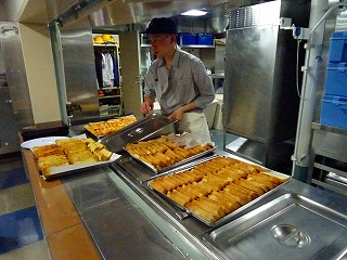 | (2015/11/15 その1 その2) 再び神棚のあるメイン甲板に戻ったあとは食堂へ。この日のランチはフレンチトーストのようです(われわれは見るだけですが)。調理員の方が黙々と作業なさっているのは、これが演習航海ではなく「本番航海最初の洋上昼食」だからなのでしょう(勝手に推測)。 |
