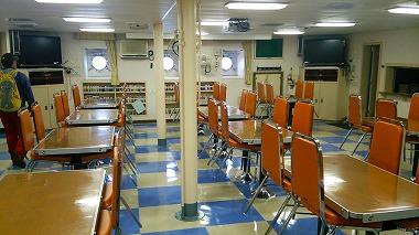 | 食堂内の椅子はただ置かれているのではなく、テーブル下の固定器具に引っかけ持ち上げられた状態で固定されていたのですが、そこから下ろせば基本的に移動自由だったというのにちょっとびっくりしました。国内を運航するフェリーなどでは椅子は鎖等で床に固定されているのが普通ですので‥。この部屋を多目的に利用するためなんでしょう。 |