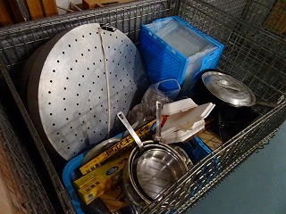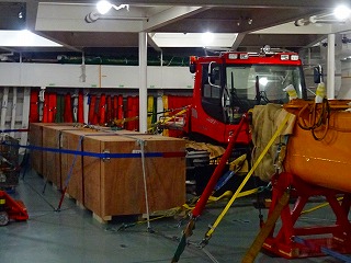 | 続いて案内されたのは倉庫です。着岸後に陸揚げされる備品が収納されていますが、案外スカスカだなという印象。まぁ南極観測は昨日今日に始まったわけではないですからそういうことかなと。ちなみにしらせが運ぶ物資の60%(重量ベース)は燃料なのだそうです。そりゃあね、「越冬」するわけですからそういうことになるわけですよね。嵩的には食糧なんでしょうが。ちなみに飲料用アルコール類は全体の何パーセントになることやら(笑)。 ところで気になったのが右上画像の調理器具。鍋やらラップやらが「何だかとりあえず入れた感じ」で置かれていますが、その鍋とかが見る限り新品には見えないんです。これは、越冬隊の調理班の方が「使い慣れた調理器具でやりたい」ってことで搬入しているのでしょうか?でもせめて埃防止のカバーくらいはあったほうがいいような気が(笑)。 |