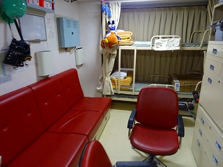 | 続いては観測隊員の居室を見学です。2人部屋ですが、その割には椅子とソファー?ソファーは「3人目の寝床」を想定して設置されているのかもしれません。 ちなみに観測隊員は日本から同行するのではなく、往路は12月上旬、寄港地のオーストラリア西岸フリーマントル港(パース)で乗船し、帰路はシドニーで下船してそれぞれ飛行機で移動するのだとか。これについては‥ |