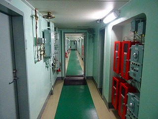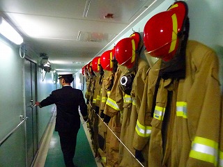 | 通路を進んでいきますが、防火服が吊り下げられた場所もありますし、右上画像では見えづらいのですが通路上にかなり近い間隔で消化器が設置されているのがわかります。それだけ船内火災には気を遣っているということです。最悪の場合「どの船も助けに行かれない」ところを航行するわけですから。 |