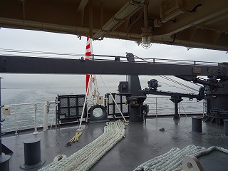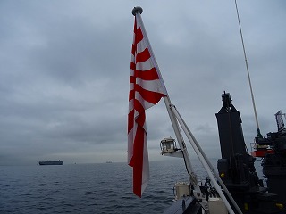 | そんなわけで船尾までやってきました。船は順調に航行しているわけですがいかんせん東京湾内なのでゆっくりですし(湾内航路の航行速度は12ノット=約22km/hに制限されています)、風も当たらない位置の自衛艦旗なので全くはためく気配もなしです(笑)。でも南極海ではすごいことになるんでしょう。 |