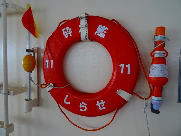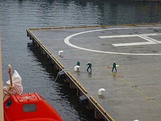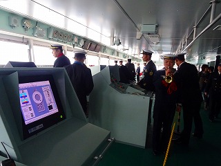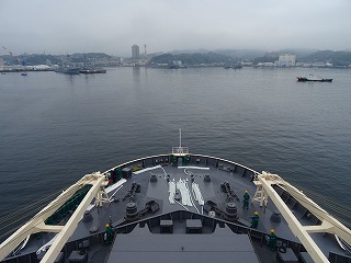 | ふり返ってみれば、長い航海が「何だかたった数時間くらい」にしか感じなかったことがフシギです(大笑)。おかげさまで後半は雨も止み、甲板で入港の様子を見ることもできてラッキーでした。ではここで、入港時の艦橋内部の様子をちらりと動画でふり返ってみましょう。ラッパも鳴りますよー。 |