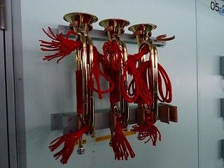 | さて続いては艦内見学の白眉たる艦橋へ。出入港の際に吹かれるラッパが4つセットされておりました(うち1つはこのあとすぐ使用されるため外されています=左上画像の方がいつでも吹けるようにスタンバイしているのが見えています)。艦長席は空席でしたが、どこかにおられたのでしょうね(右上画像マウスオン)。 |