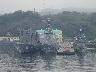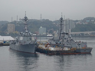 | ここ横須賀港は自衛隊と米軍の強要基地でもありますから米艦船も入港しています。左画像が米軍、右画像が自衛艦ですが、艦船番号の表示以外には区別できませんね(実は米艦船のほうが「ちょっと薄汚れている」のですが)。 |