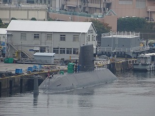 | 潜水艦もいました。港内のエリア的には米軍のものなのでしょうか?そうこうしているうちにタグボートが接岸作業に入りました。初めて知ったのですが、タグボートと船体の接触箇所からは散水がなされているのですね(右上画像マウスオン)。これが海上自衛隊のみの装備なのか、一般船舶のタグボートでも同じなのかはわかりませんが。ただ、どのタグボートも船舶火災に備えて散水銃などは装備されているようです。 |