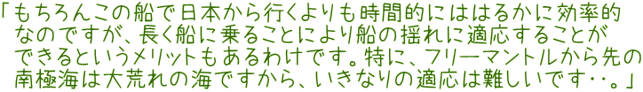 | なるほど。観測隊員は船に慣れているわけでもないですから、その苦しみたるや‥逃げ場もないし、ある意味地獄絵図なのでしょう(もちろんそのことを含め覚悟の上で参加なさっているわけですが)。 |