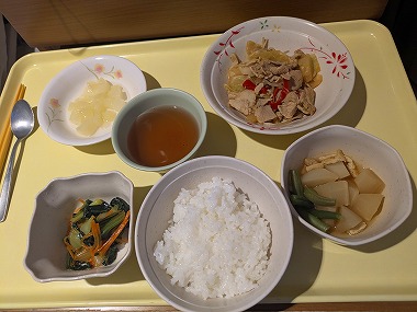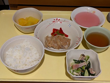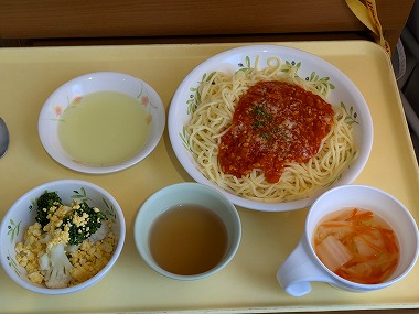 さて手術は翌日の午後なので、今晩(21:00)からは水やお茶系以外の摂取は不可となるようです。ただお昼前から部屋に入ったので、お昼ごはんも提供されました。ミートソースかぁ。やや薄味でイマイチでしたが(当然)、想像していたよりも普通の食事でした。後日某氏聞いた話によると病院の食事は「ケータリングの会社の方針及び経費」によるのだとか。さもありなんというところです。 |