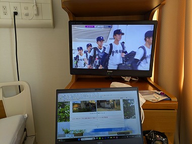 さてこの日は入院したとはいえ事前の検査があったとはいえ点滴等もなく、「手術前の安静日」というところでした。個室だしTVも椅子や机もあるので、高校野球を見たり、持ち込んだPCで夏のお出かけ編ページを作ったりしていました。いつもと違うのは「お酒を飲みながらではない」ことくらいです。 |