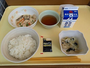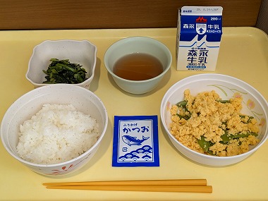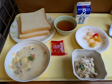 明けて退院日の朝となりました。朝食は初めてのパン2枚、何だかはるか昔の給食を思い出します。バターやマーガリンはなくジャムのみで、これは「シチューに浸して食べてね」という無言の意図を感じずにはいられませんしもちろんそうしました。そうなると牛乳ウマー♪でもありますし。 |