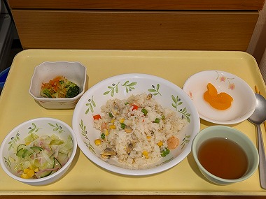 またもお食事。いや悪くもないですよ本当に。入院初日昼食のナポリタンを食べたときは「うむぅ、こんな感じ(のご飯)で数日間過ごすのか」と気が重くなりましたが、あのご飯以降はだいたいOKでした。左上画像のチャーハンも案外味があって合格点。 |