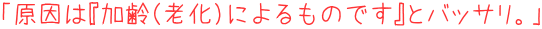 確かにネット上の信頼できそうな情報でも「加齢による」がほぼ全てでした。まぁアヤシイ「これがアブナイこれで治る」系サイトがあまり無かったことが救いでしょうか(苦笑)。それにしてもこのページをタイプしている時点で61才のTakemaですが、やっぱり身体はどんどんと衰えてきているのね(しみじみ)。 |