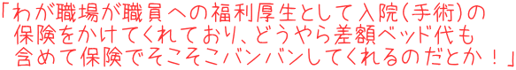 との通知が!これにはびっくりしました。大きく焼け太りしてしまった(笑)。やはり保険には入っておくべきですね。ただし当然のことながら、これまで払い込んだ保険料の総額からすると全然元は取れていないことを申し添えます(大笑)。まだこれくらいの手術ですからね、そもそも保険とは「いざ(にっちもさっちも)という時のための準備」ですから。 |