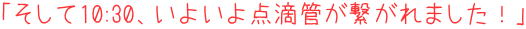 手術当日はまだ起き上がれませんでしたし水分も「寝たまま飲める」器具を付けながらの摂取でしたが(ちなみに手術前に下剤で大は排出完了済み、小は尿道カテーテルにて勝手に排尿していました)、翌日の朝、状況を確認後は立ち上がる許可が出て、カテーテルも外されました。 |