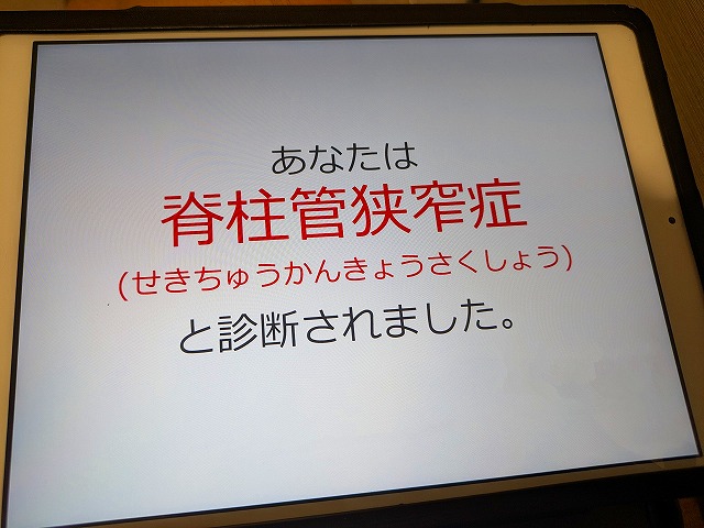 というわけで、この腰部術例では全国的にも実績のある病院へ(とはいえ電車で2駅先の近場です)。その診断結果はタブレットで渡されました(ページトップ画像及び下の画像2枚)。他にもいろいろ説明がありました。 |
