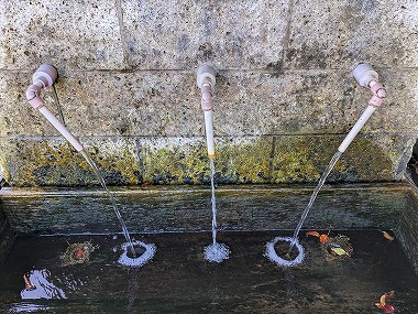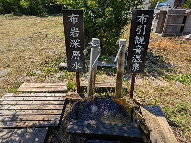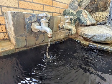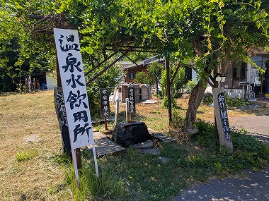 嬉しいことに駐車場脇に「温泉水飲用所」があり、誰でも自由に飲ませていただけます(もちろん施設利用者前提ですが)。こちらの温泉は地下850mからの掘削自噴(42.6度)。泉質はナトリウム-塩化物泉ですが、塩気は僅かに感じる程度でうっすら硫黄臭と金気味。 |