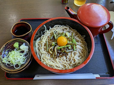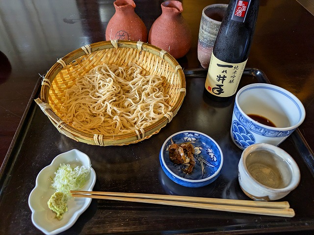 やや熱めの適温湯(湯触りはごく普通)をタンノーしたあとはお昼ごはんです。湯の坪街道界隈のテイクアウトでお茶を濁すのもナニだったので、ここはしっかり調べておきました。なぁに、いつものようにお蕎麦です(笑)。 |