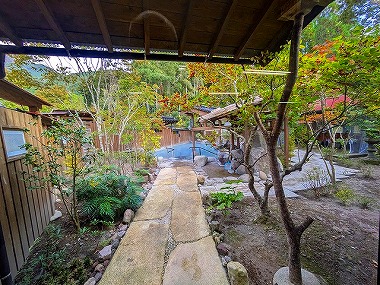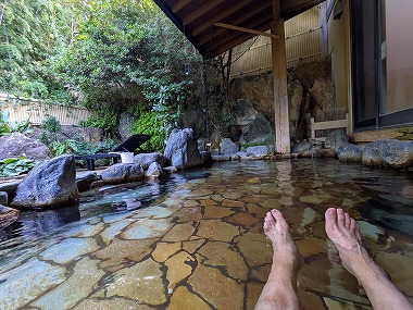 ただ実は、今回は先客さんがおられまして最初はカメラ持ち込みを遠慮しました。で、しばらく浸かっていたところでその方に話しかけてみたところ、何と韓国の釜山からお越しのソロ旅行者氏であることが判明。以降は英語で話したところ、日本の温泉にハマっており、ここも「5-6回目の訪問」だとのことです。うわ、湯の坪共浴に関しては先達だぁ(自分は2度目)。 |