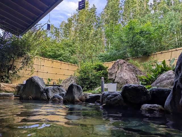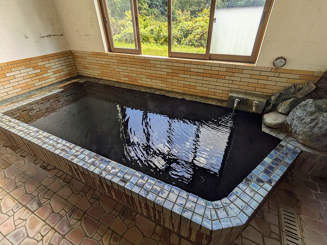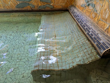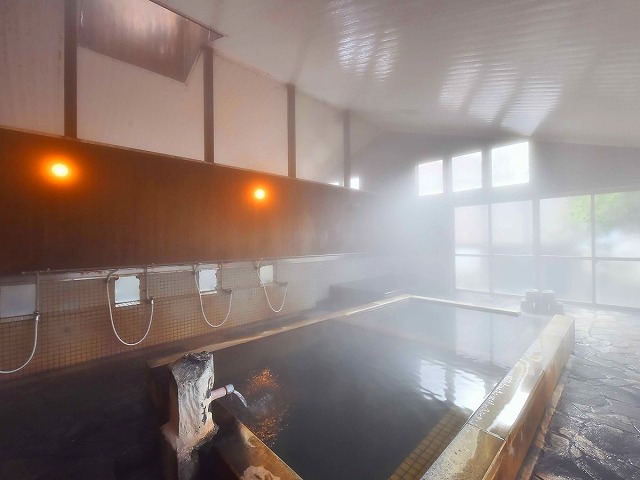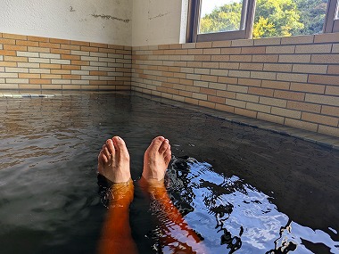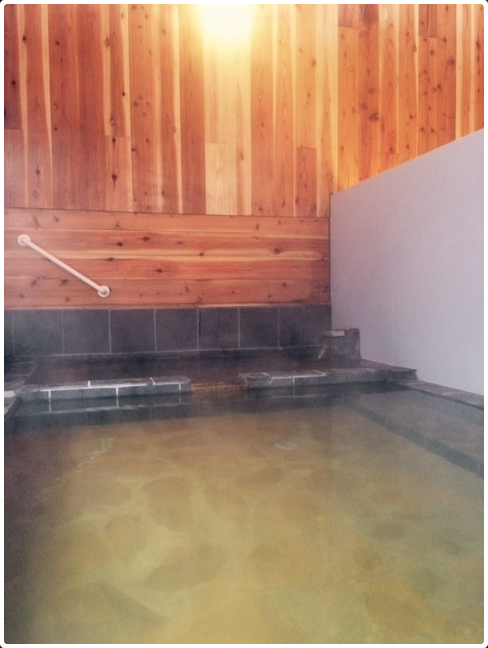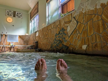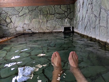 真ん中に浴槽どどんというのは青森県の温泉銭湯をホーフツとさせます。かけ流し湯がとろとろと注ぎ込まれており、手前があつ湯、浴槽の途中で仕切られた奥のほうがぬる湯となっていますが、そもそもの源泉温度が42.6度ですから「ノーマル湯温&ややぬる湯」という感じでした。この日は夏の暑い時期でしたから40度あるかないかのぬる湯が心地いい‥いやそれだけじゃありません! |