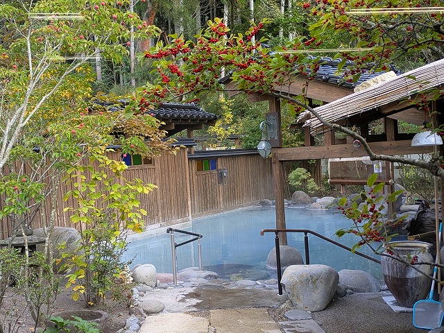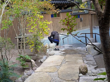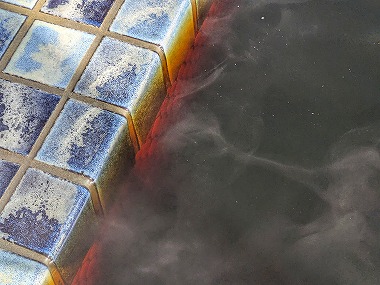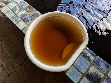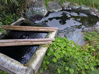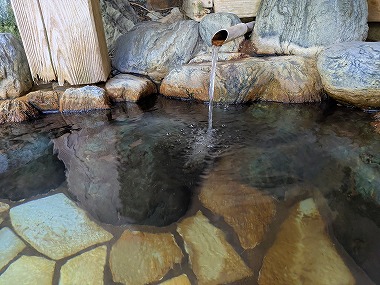 露天風呂の湯口から流し込まれているのはぬる湯だったのでおそらく源泉をそのまま投入しており、どこかで加温用の吸い込み‥と思ったのですが吸い口を見つけられませんでした(湯底の口からは吸い込み気配がありませんでした)。 |