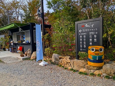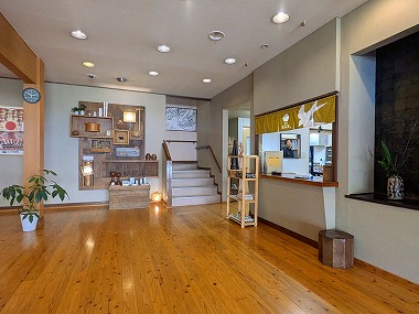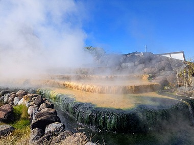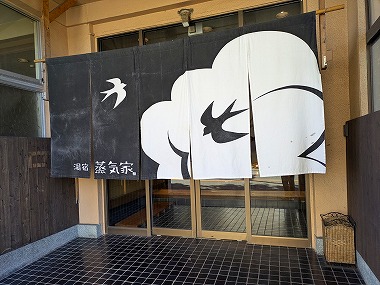 建物脇の温泉蒸し釜では当然調理もできるのでしょうが、それは次回訪問のお泊まりお楽しみに回すとして、まずはエントランスへ。うわ先客さんの靴がない、こりゃいけるかも!(長居はもとより不可能ですが)。 |