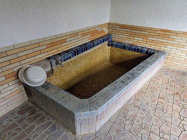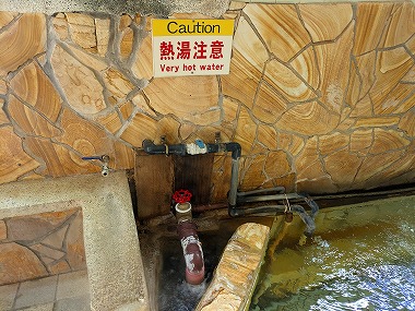 なお上画像ではオーバーフローがないように見えますが、実際は右側の石の手前あたりからじわじわフローしていました。投入量も多くはないのでフロー量も少ないのは仕方がありません。ちなみに前回同様小さい浴槽は使用されていませんでした。こちらはどういう湯使いをしていたのだろう?蛇口は一つだし、まさか「源泉そのまま浴槽」だったりしたのかな?(源泉温度24.8度)。調べてみたらやはりそうだったようです。源泉の湧出は豊富そうだし夏は良さそうだなぁ。 |
