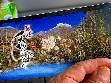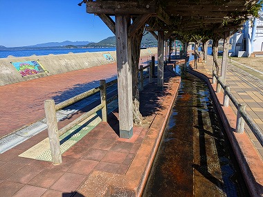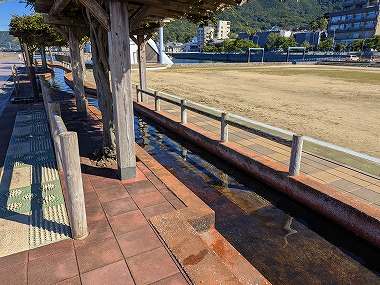 別の日ですが小浜温泉にて30分休憩ということになりました。ここには長ーい足湯があるのですが、いやでもちょっと待て、源泉温度105度というアツアツの湯が湧くこの地で足湯だけというのもないだろうということで、ダッシュで(走れないので引きずり系の早足で)お風呂へ。 |