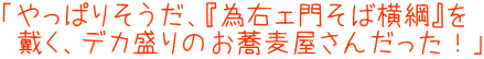 かつてTakemaオフキャンプにもご参加いただいたマエダンゴさんなどもかつてこちらで「為右ェ門そば 横綱」に挑戦されていたことを思い出しました(サイト更新はずいぶん前に停止しておられますが、該当ページはこちらです(最終更新は2010年))。そうかぁこちらのお店、「デカ盛りの聖地」だったんだぁ(驚)。なお、今も「小結・大関・横綱」のラインアップは継続提供されているようです。 |