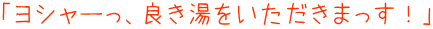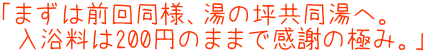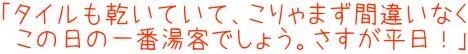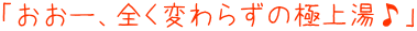 身体も頭も全部洗ってさらに湯ったりしていたら次のお客さん(若者2人組)が入ってきたので上がる準備を始めましたが、彼らも「何このヌルヌルしたお湯は!」とびっくりしている様子でした。さもありなんですが、でもさ、家のお風呂じゃないんだから(いや家のお風呂でもそうですが)湯に浸かる前には肝心なところを洗い清めて下さいね。というかかけ湯すらせずにダイレクトに湯に浸かっちゃダメよん。 |