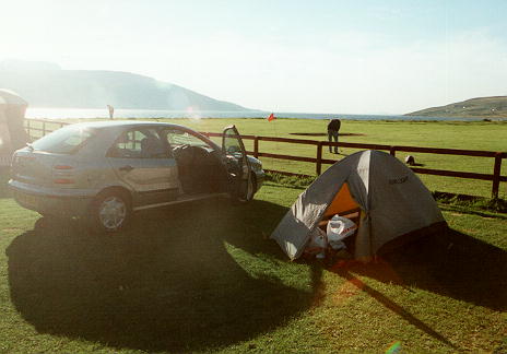 さて、ヘブリディーズ諸島から再びスカイ島に戻り、ここでもう一泊しようと思ったが、どうしよう・・と思いつつ運転しているうちに本土への橋まで来てしまった。ま、いっか、と思い、 Ullapool まで行ってしまうことにする。しかし、本土に戻ったあたりから天気は下降曲線をたどり、「そのままスカイ島にとどまってりゃよかったなあ」と後悔するが後の祭りである。やっとこさ着いた Ullapool は天気こそいいものの、何だかキャンプ場はえらく混んでいる。そりゃ町中にあって何かと便利だから混んでるのも仕方ないが・・と思いつつ場内の空き場所を探しているうちと、一番奥があいていた。そのまた奥はゴルフ場。おかげでゆったりと広々していて環境はまことにいいし、すぐ横の堤防の上にあるベンチに座って景色を眺めていると、何だか江戸川の堤防から川を眺めてるっていう感じがしてなかなか良かったのだ。ただ、町中だというのに(おまけに奥に見えるのは川じゃなくて海だというのに)midge の奴らがちらほらいるのには閉口したけれど。