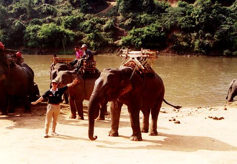 そうなのだ。二人で乗っても一人ずつ乗っても一人あたりの値段は同じなのだ。それなら当然貸し切って乗ったほうが面白いということで、別々の象に乗ることにする。こんなゼータクが出来たのもたぶんすいてたからだろう。白人の姿はちらほらあったが(どうやら市内の旅行会社か何かがツアーを出しているみたいだ)、ここでも日本人の姿はなし。というよりは、この旅行中他の日本人に会ったことはほとんどなかった。約1名(後述)を除いては。