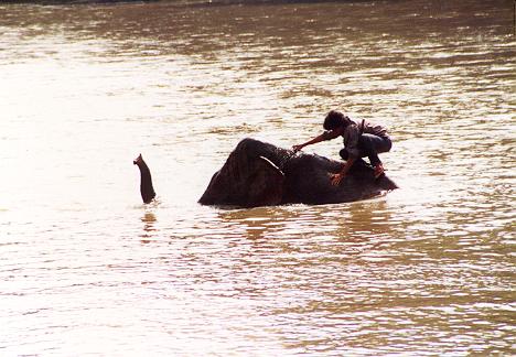 最後は川の中を行くこともあり、なかなか変化があっていいのだが、まあ、乗りやすいものではないのは確かだ。ちなみに、1匹の象には必ず定まった象使いがいて、象使いと象との間にはきちんと信頼関係が構築されているらしい。川の中で象の身体を洗ってやっている象使い(右上の写真)を見ているうちに何だかほのぼのとしたものを感じてしまった。